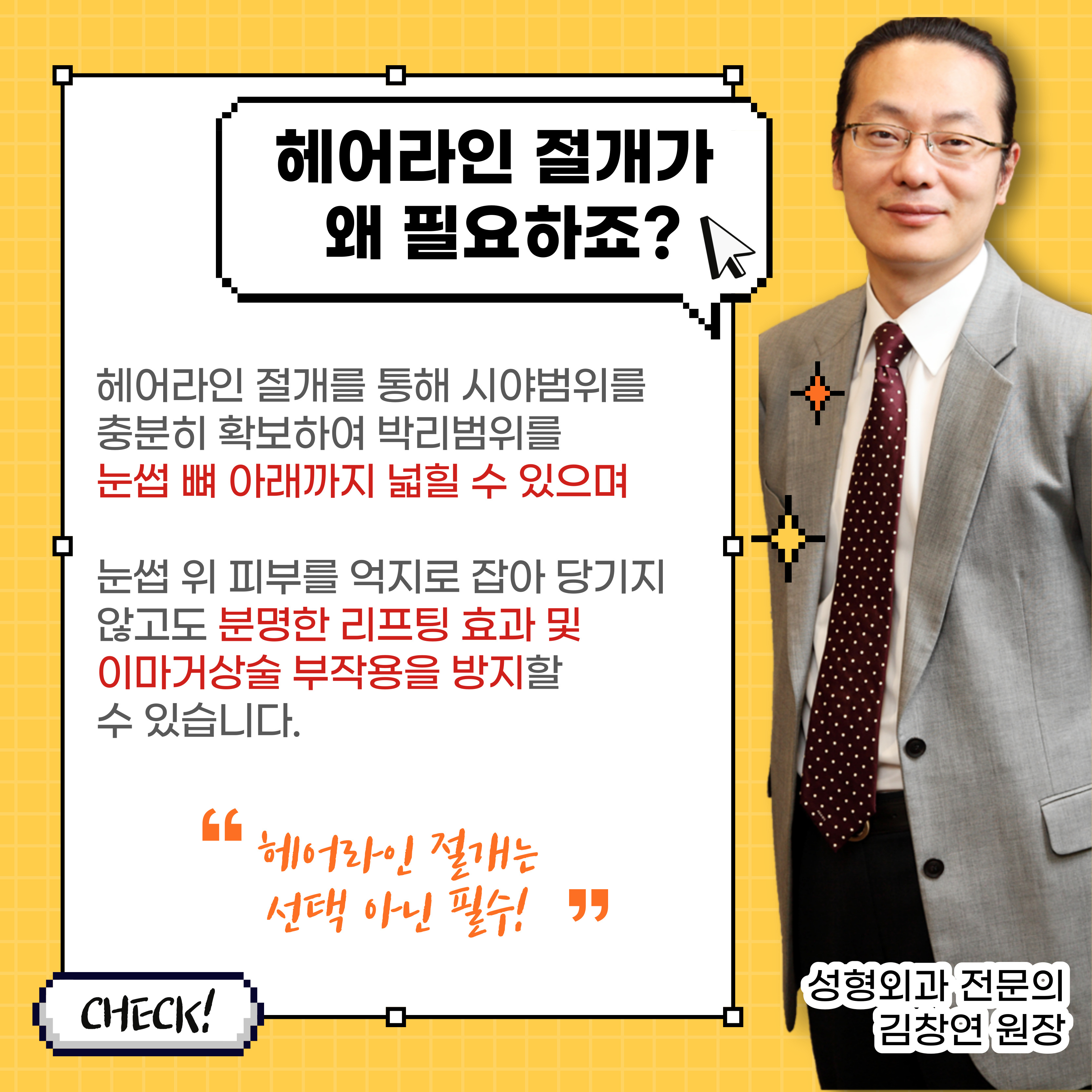 그리고 눈썹위피부가 세게 당겨져 눈꺼풀도 따라 올라가