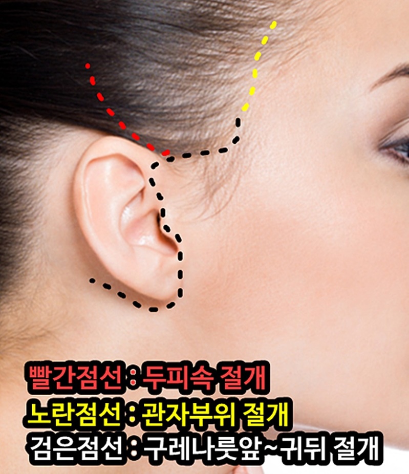 보통 관자부위까지 절개선을 연장하여